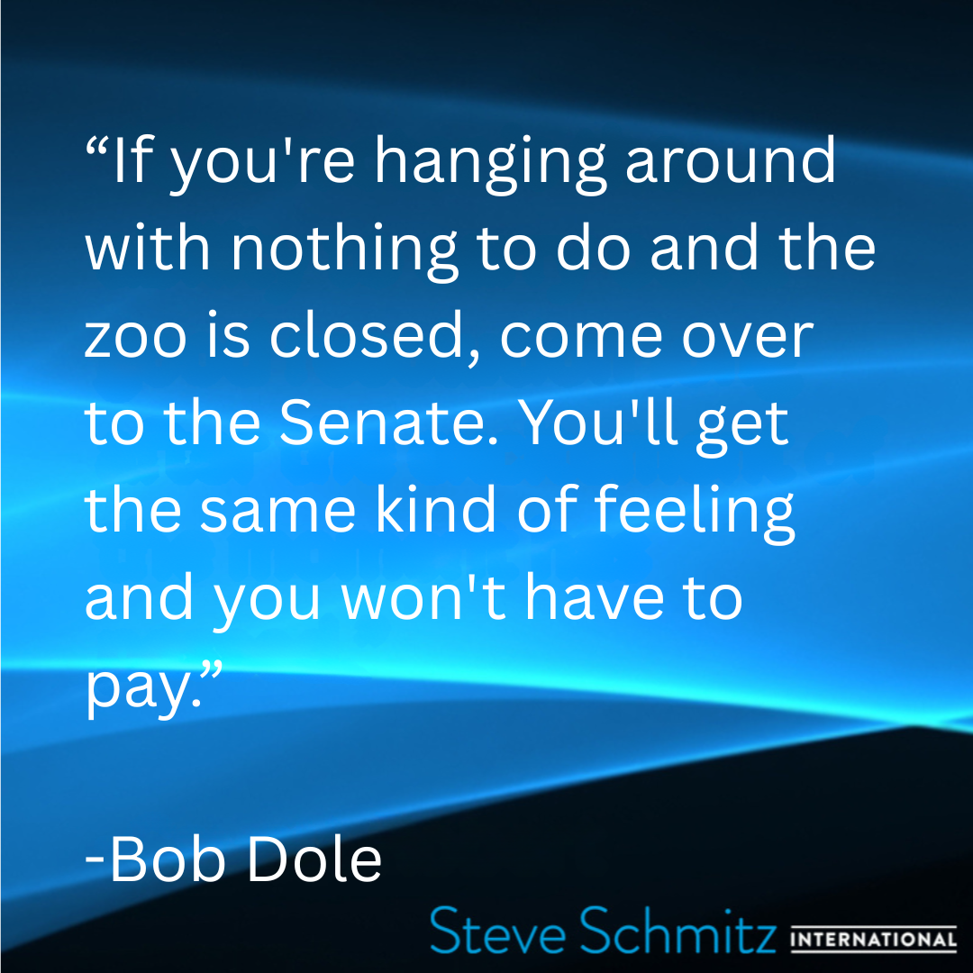 July 30, 2025 July 30, 2025/in Quote of the day /by Steve Schmitz Steve Schmitz Quote of the Day, Bob Dole “If you’re hanging around with nothing to do and the zoo is closed, come over to the Senate. You’ll get the same kind of feeling and you won’t have to pay.” https://steveschmitzinternational.com/wp-content/uploads/2018/06/Steve-Schmitz-Logo-W.png 0 0 Steve Schmitz https://steveschmitzinternational.com/wp-content/uploads/2018/06/Steve-Schmitz-Logo-W.png Steve Schmitz2025-07-30 03:00:082025-08-07 07:34:15July 30, 2025