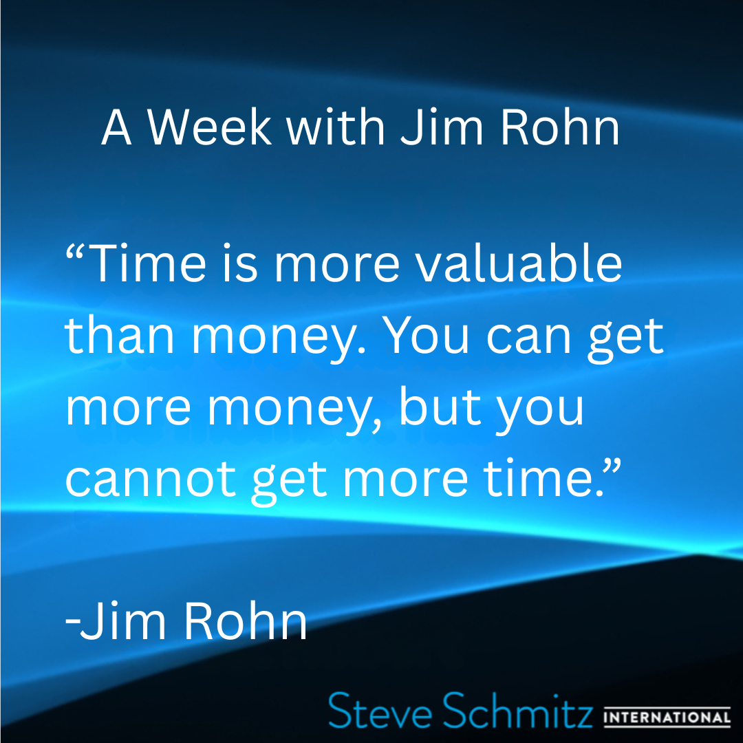 August 17, 2021 August 17, 2025/in Quote of the day /by Steve Schmitz Steve Schmitz Quote of the Day, Jim Rohn “Time is more valuable than money. You can get more money, but you cannot get more time.” https://steveschmitzinternational.com/wp-content/uploads/2018/06/Steve-Schmitz-Logo-W.png 0 0 Steve Schmitz https://steveschmitzinternational.com/wp-content/uploads/2018/06/Steve-Schmitz-Logo-W.png Steve Schmitz2025-08-17 03:00:532025-09-08 05:50:37August 17, 2021