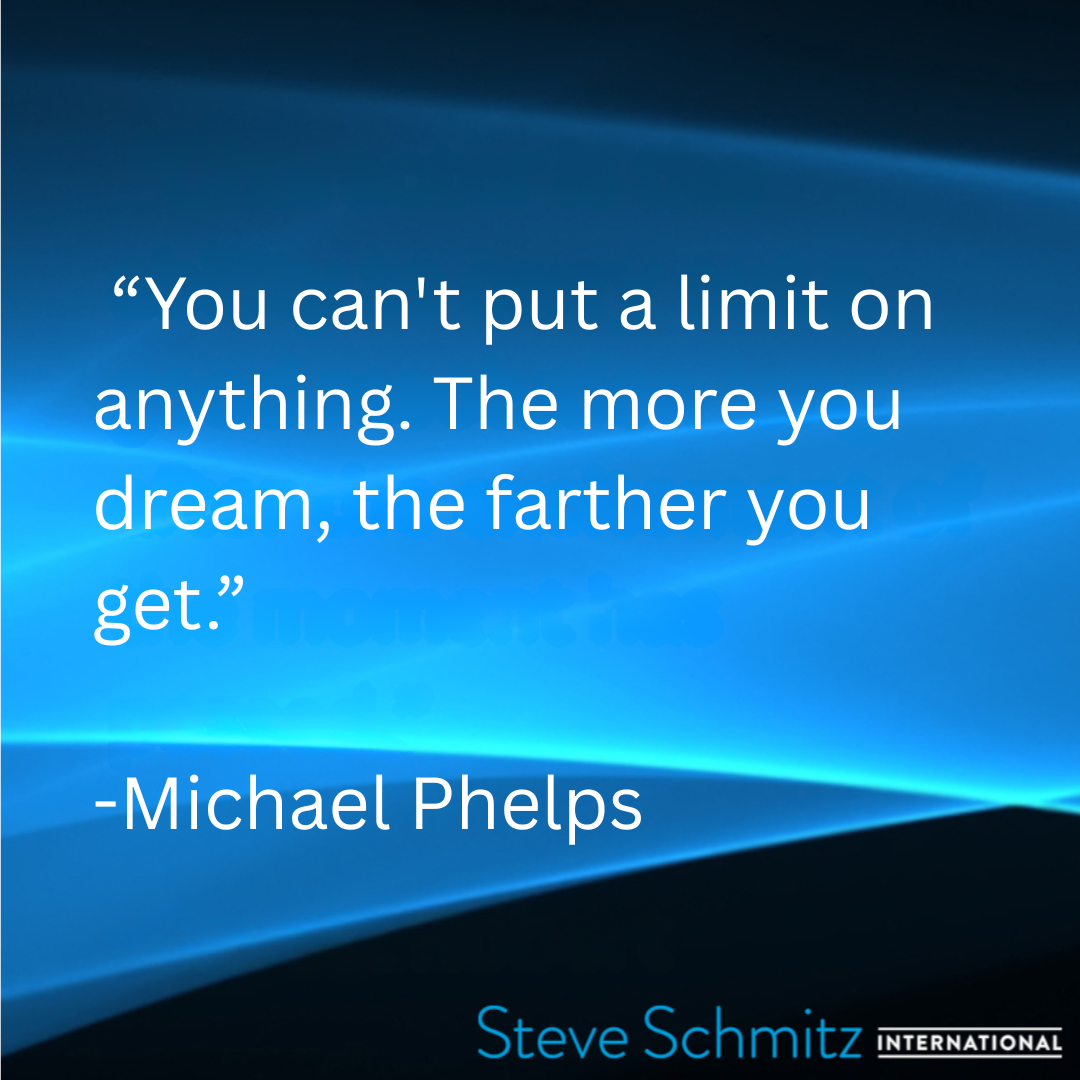 August 22, 2025 August 22, 2025/in Quote of the day /by Steve Schmitz Steve Schmitz Quote of the Day, Michael Phelps “You can’t put a limit on anything. The more you dream, the farther you get.” https://steveschmitzinternational.com/wp-content/uploads/2018/06/Steve-Schmitz-Logo-W.png 0 0 Steve Schmitz https://steveschmitzinternational.com/wp-content/uploads/2018/06/Steve-Schmitz-Logo-W.png Steve Schmitz2025-08-22 03:00:032025-09-08 06:00:44August 22, 2025